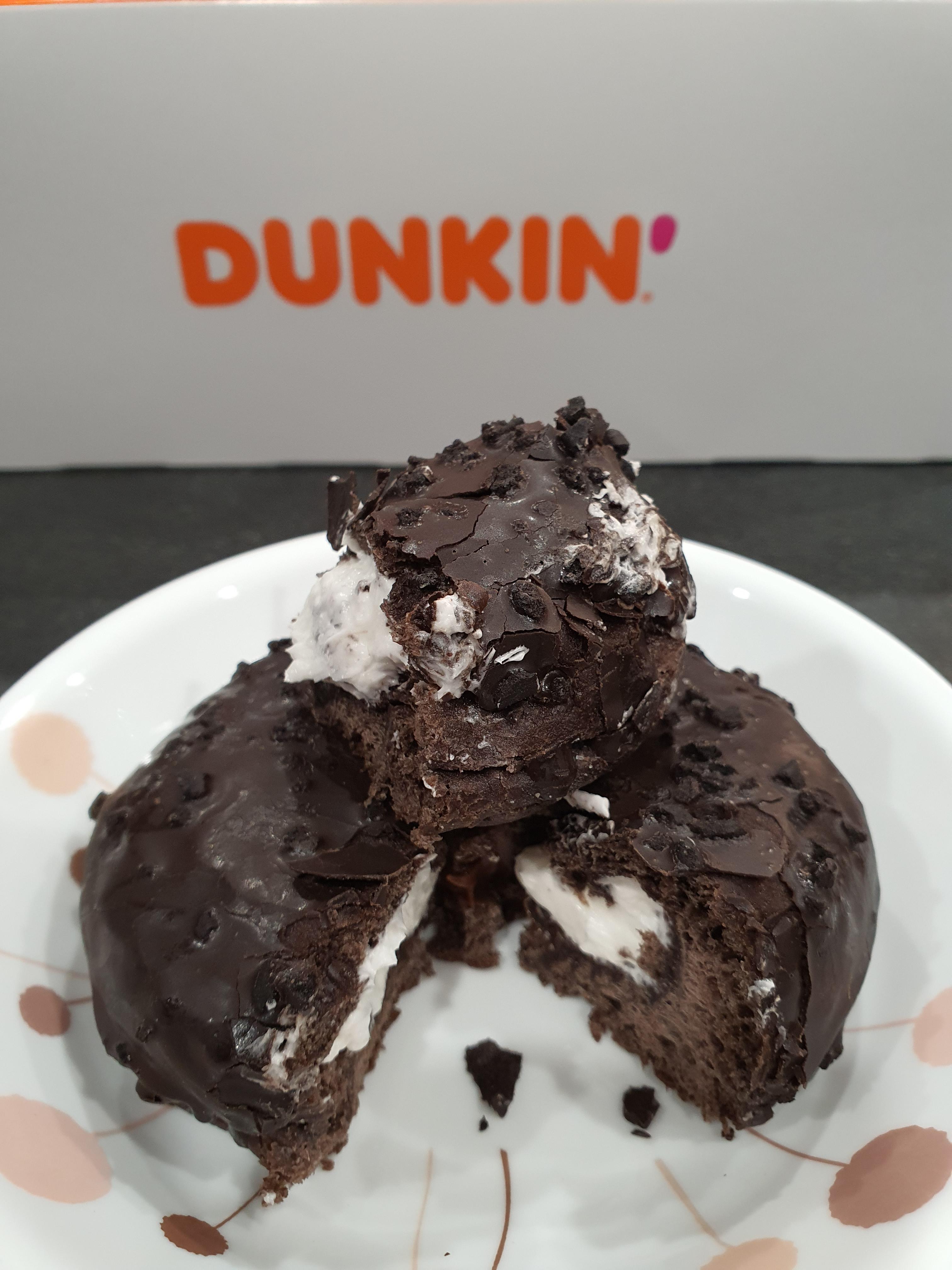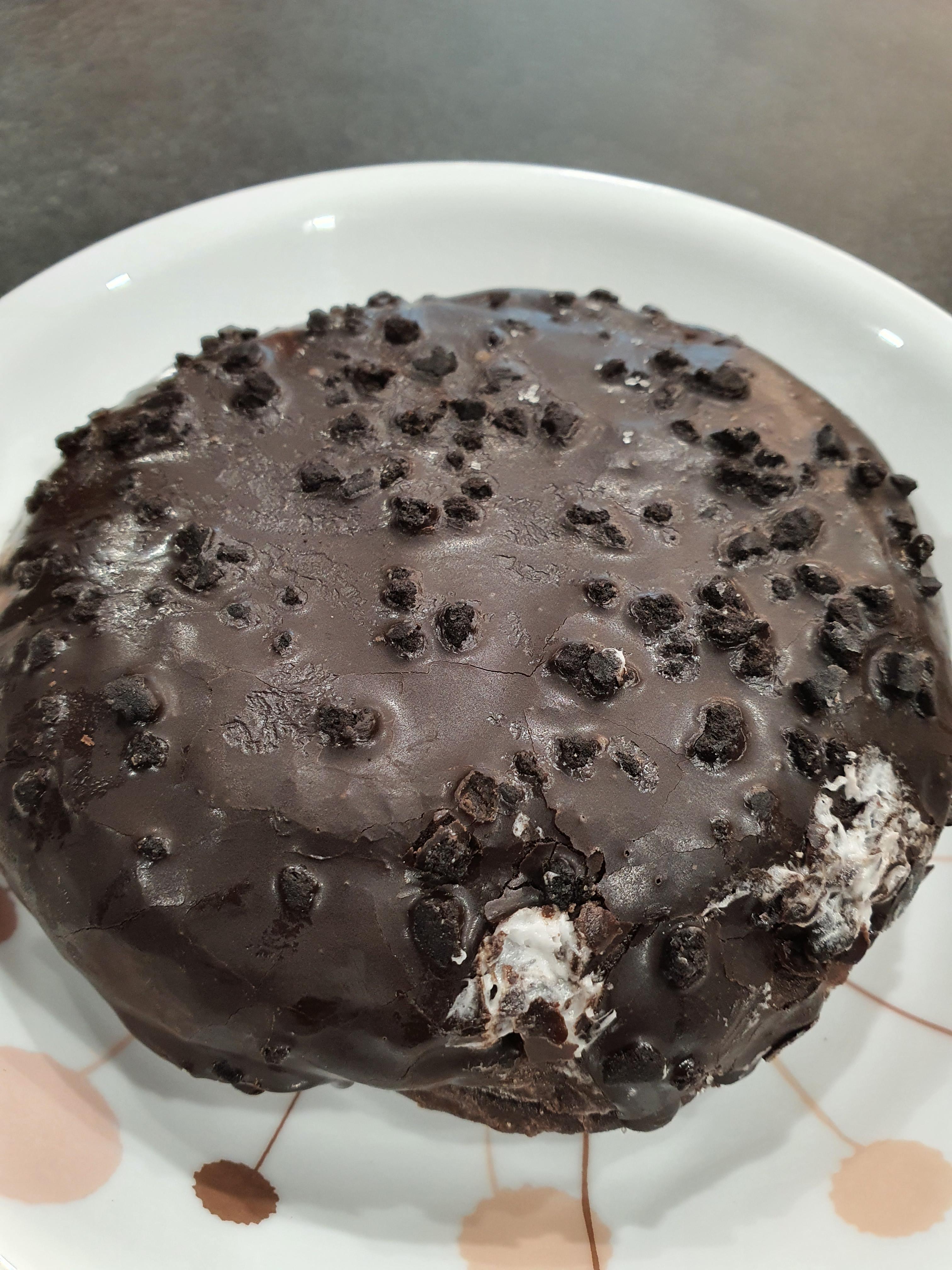 블랙카카오로 반죽한 블랙도넛에 초코&화이트 크림을 채우고 쿠키를 토핑한 제품