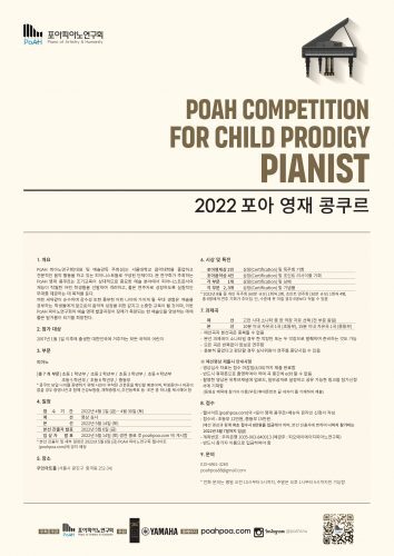 2022 포아 영재 콩쿠르 2022 PoAH Competition for Child Prodigy Pianist 참가신청서 작성하기 1. 개요 PoAH 피아노연구회(대표 및 예술감독 주희성)는 서울대학교 음악대학을 졸업하고 전문적인 음악 활동을 하