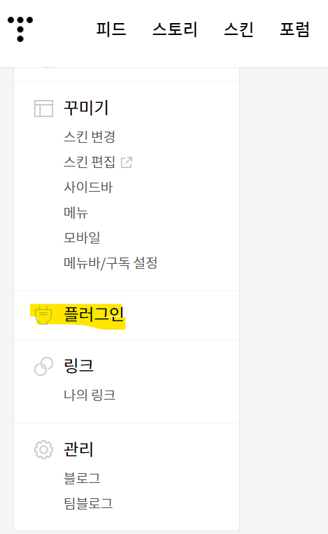 1. 티스토리 관리 페이지에서 왼쪽탭에서 "플러그인" 클릭!